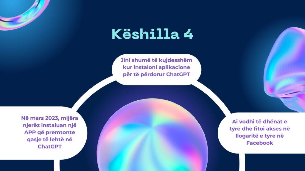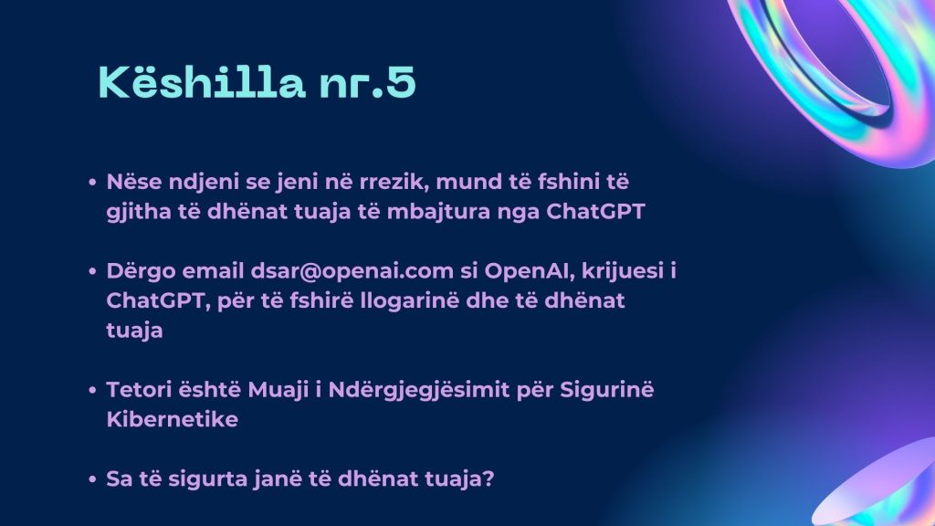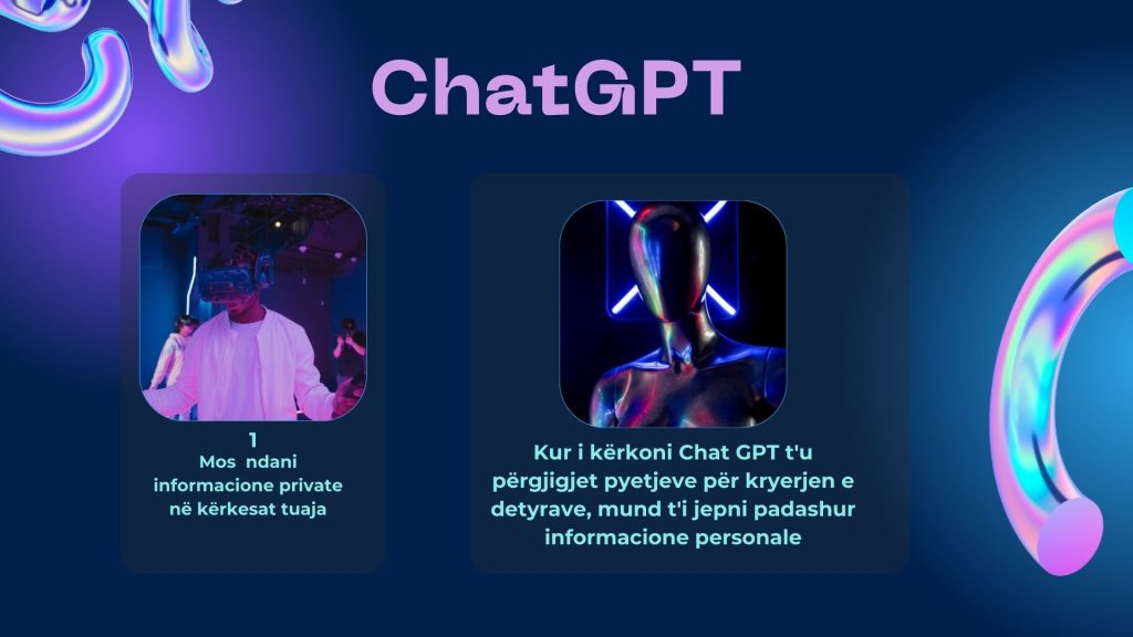 Kur komunikonit me ChatGPT, kujdesuni të mos ndani informacione personale të ndjeshme. Nuk është e sigurt të jepni informacione të tilla në një bisedë me një mjet AI.