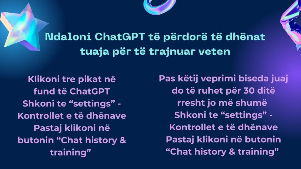 Në rast se dëshironi të ndaloni ChatGPT nga përdorimi i bisedave tuaja për trajnim, mund ta bëni këtë nëpërmjet cilësimeve. Për ta bërë këtë, shkoni në “Cilësimet – Kontrollet e të dhënave” dhe mbyllni opsionin “Historiku i bisedës dhe trajnimi”. Kjo ndihmon në mbrojtjen e privatësisë suaj.