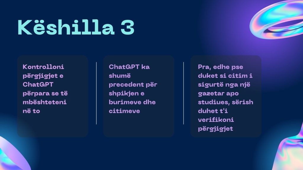 ChatGPT është i fuqishëm, por duhet të verifikoni përgjigjet e tij për faktet dhe të kujdeseni për burimet e tij. Nuk duhet të mbështetemi automatikisht në çdo gjë që thotë.