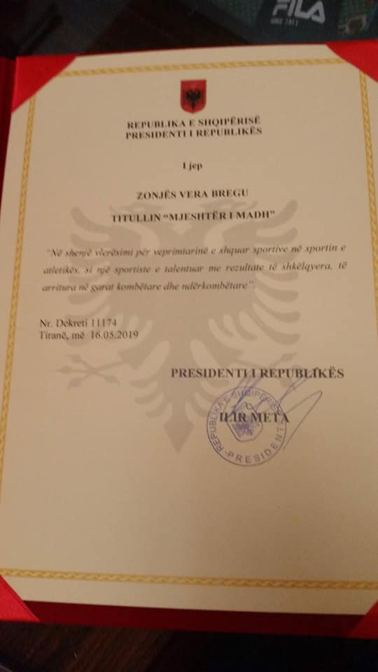Një nga sportistet më të njohura të brezit tim, një nga emrat më të spikatur të sportit të atletikës shqiptare dhe shkodrane në veçanti, Vera Bregu, u nderua sot me titullin “Mjeshtër i Madh”, akorduar nga Presidenti i Republikës, Ilir Meta. “Në shenjë vlerësimi për veprimtarinë e shquar sportive, si një atlete e talentuar me rezultate të shkëlqyera të arritura në garat kombëtare dhe ndërkombëtare.” Dekret Nr. 11174, Tiranë, 16.05.2019.