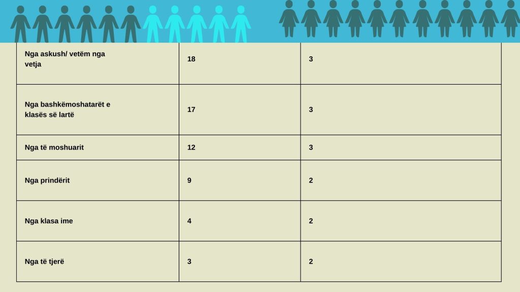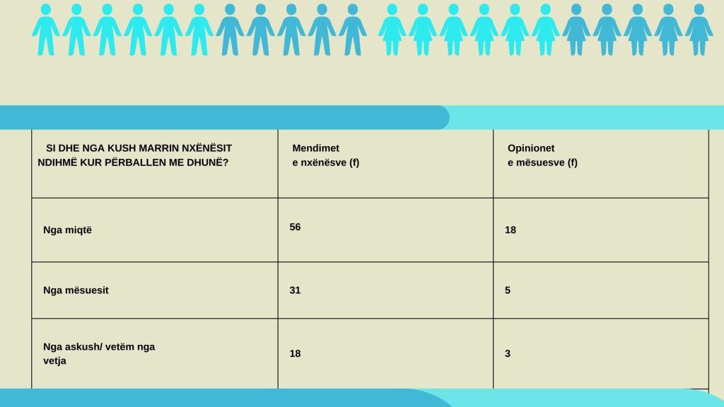 Nxënësit dhe mësuesit raportuan se ata që përballen me dhunë marrin ndihmë nga shokët e tyre. Tabela 1 tregon se si dhe nga kush marrin nxënësit ndihmë kur janë përballur me dhunë.