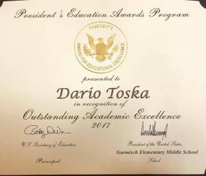 Djali i ish-ministrit me anë të këtij kësaj certificate është bërë pjesë e nxënësve fitues të programit “President’s Education Aëards”.