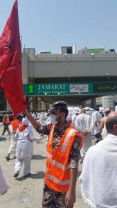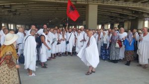 Pelegrinët shqiptarë në një nga momentet kulminante të peligrinazhit (Jamarat vendi ku goditet djalli me gurë) me falmurin e Skënderbeut në duar.
