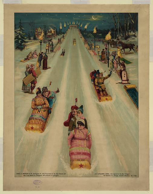 Një reklamë e vitit 1887 për Star Toboggans, tregon si njerëzit udhëtonin natën apo ditën në stinën e ftohtë të dimrit.