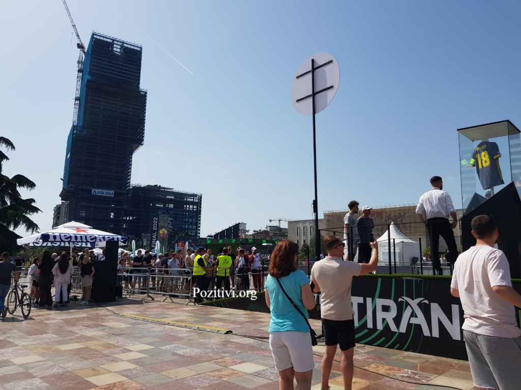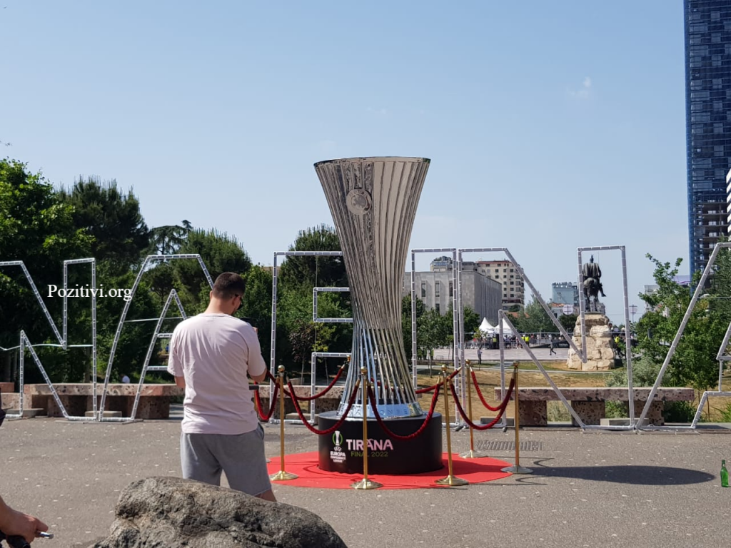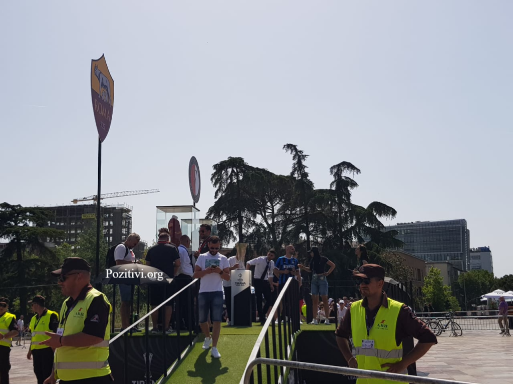 Pak metra më tutje në sheshin Skënderbej, përpara finales së Conference League, tifozët kanë pritur në radhë për të bërë foto me imitimin e kupës.