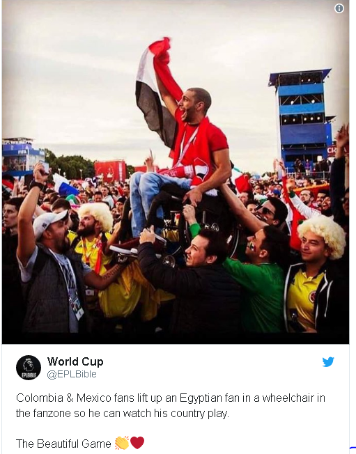 Ekipi egjiptian ishte duke luajtur kundër Uruguait kur u bë kjo foto, dhe pavarësisht se spektatorët po e shihnin lojën vetëm në një ekran në zonën e tifozëve të FIFA-s në Moskë, ata ishin më se të lumtur të mbanin personin me aftësi të kufizuara mbi shpatullat e tyre.