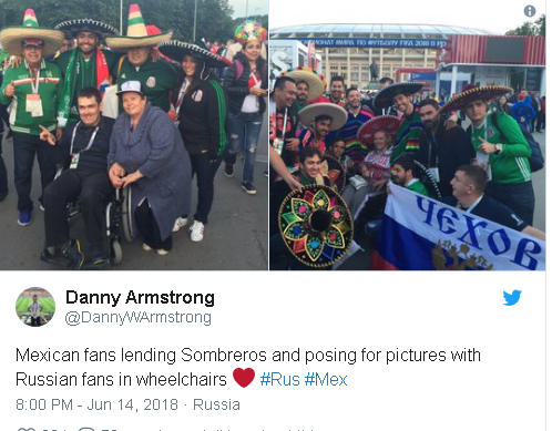 Së fundi, disa meksikanë fituan zemrat në internet, kur u fotografuan duke dhënë kapele të mëdha për rusët me aftësi të kufizuara. Por ky gjest nuk u shpërnda vetëm tek personat me aftësi të kufizuar por edhe tek çdo tifoz që ndanë dashurinë për Kupën e Botës.