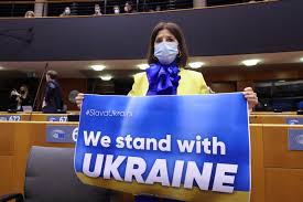 Ngjyrat kombëtare të Ukrainës dominonin imazhin e sallës plenare dhe të hollit në selinë e Parlamentit të BE-së në Bruksel. Shumë deputetë europianë kishin veshur në shenjë solidariteti bluza me flamurin e Ukrainës, parrullat ishin të lyera ose në blu ose në të verdhë, po me këto ngjyra ishte edhe veshja e komisares së BE-së për Konkurrencën, Margrethe Vestager.