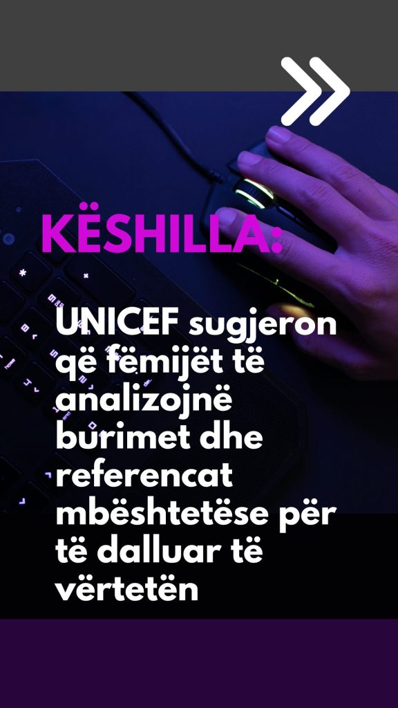 UNICEF thekson rolin e prindërve dhe mësuesve në edukimin e fëmijëve për të zbuluar lajmet e rreme. Ata sugjerojnë që fëmijët të analizojnë burimin e informacionit dhe të kuptojnë nëse ka referenca mbështetëse. Përmes këtij procesi, fëmijët zhvillojnë aftësi kritike për të dalluar informacionet e besueshme nga ato manipulative ([UNICEF]