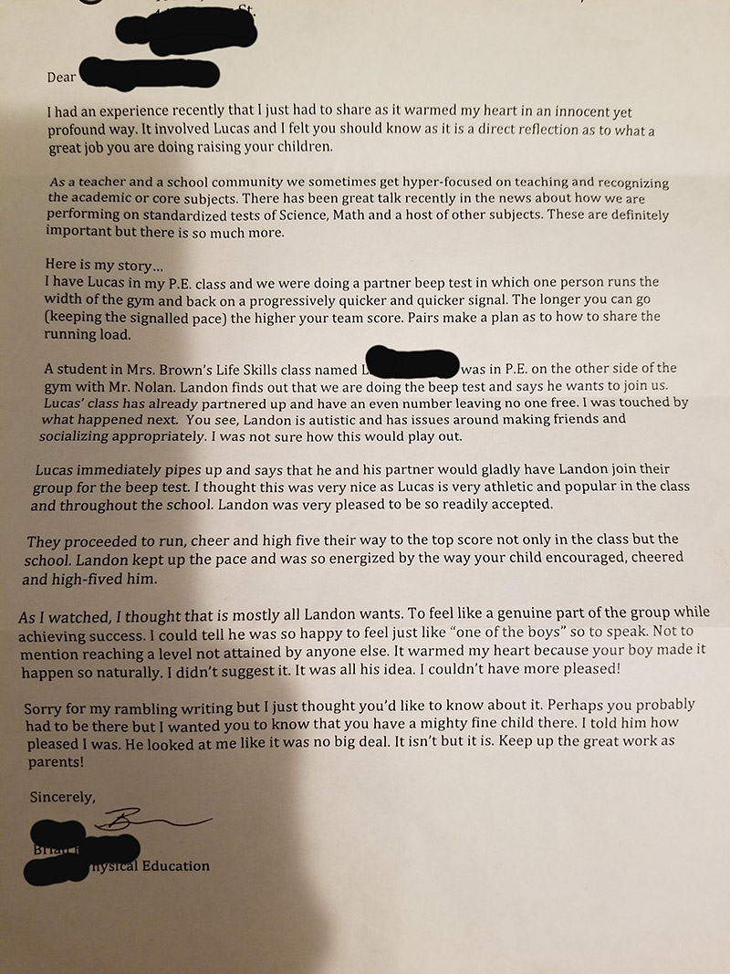 Në letër, mësuesi i edukimit fizik shpjegon se si Lucas, i cili është atletik, menjëherë ftoi një nxënës me autizëm për t’u bashkuar me ekipin e tij. Prindërit krenarë dërguan një fotografi të letrës, në mënyrë anonime, në Reddit.