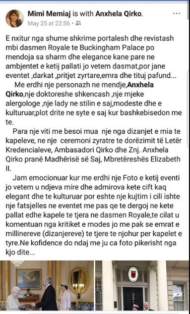 Memiaj bën me dije se një vit më parë Qirko i kishte besuar asaj dizejnimin e një kapeleje në një ceremoni zyrtare të dorëzimit të Letër Kredencialeve, Ambasadori i Shqipërisë Qirjako Qirko dhe Anxhela Qirko pranë Mretëreshës Elizabeth. Ndërsa më tej e emocionuar ka ndarë dhe fotot gjatë takimit në event. Është emocionuese dhe e rrallë që shqiptarët të marrin pjesë në evente organizuara në pallatin mbretëror.