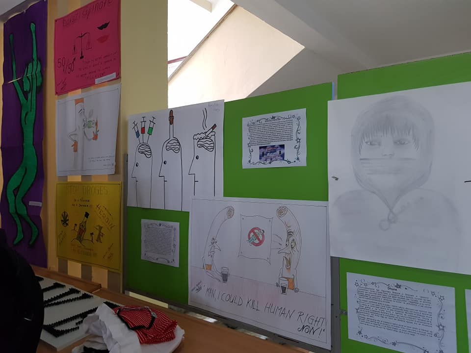 Punimet e ngjitura në mur dhe jo vetëm ishin të realizuara me dorë nga vetë nxënësit, duke shfaqur ide dhe mesazhe nga më të ndryshmet. “Jetët tona fillojnë të marrin fund, ditën kur fillojmë të heshtim për gjërat që kanë rëndësi”, “Të luftojmë trafikimin me njerëz”, ishin këto disa prej mesazhe që ranë në sy të vizitorëve të ekspozitës.