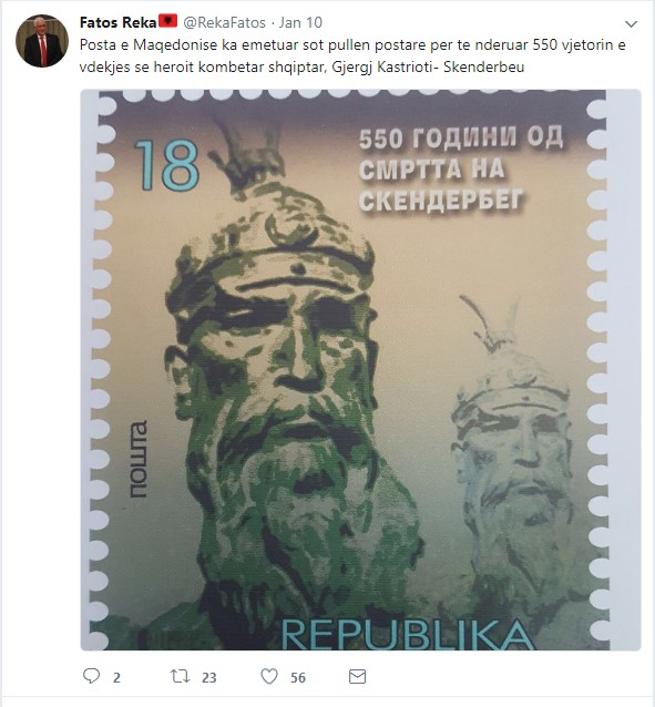 Këtë lajm e ka bërë me dije ambasadori shqiptar në Maqedoni, Fatos Reka përmes një postimi, ku vërehet se pulla e re postare mban emrin dhe foton e Skënderbeut. “Posta e Maqedonisë ka emërtuar sot pullën postare për të nderuar 550 vjetorin e vdekjes së heroit kombëtar shqiptar Gjergji Kastrioti Skënderbeu”, shkruan Reka. 2018 është shpallur viti i Skënderbeut dhe nga kryeministri Edi Rama dhe priten jo pak surpriza.