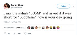 “Pashë inicialet “BDSM” dhe e pyeta nëse ishte shkurtimi për; “budizëm”, si po të shkon dita jote”.