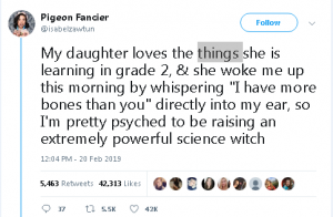 “Vajza ime i do gjërat që mëson në klasën e 2-të dhe më zgjoi këtë mëngjes duke pëshpëritur “unë kam më shumë kocka se ti”, direkt në veshin tim, kështu që unë jam duke rritur një magjistare jashtëzakonisht të fuqishme shkencore”.