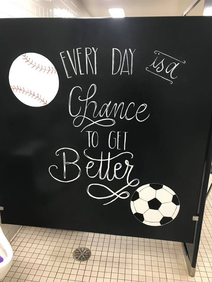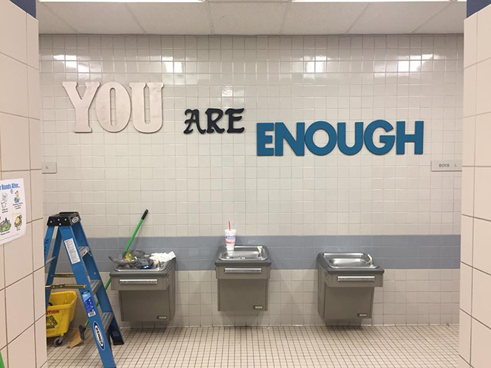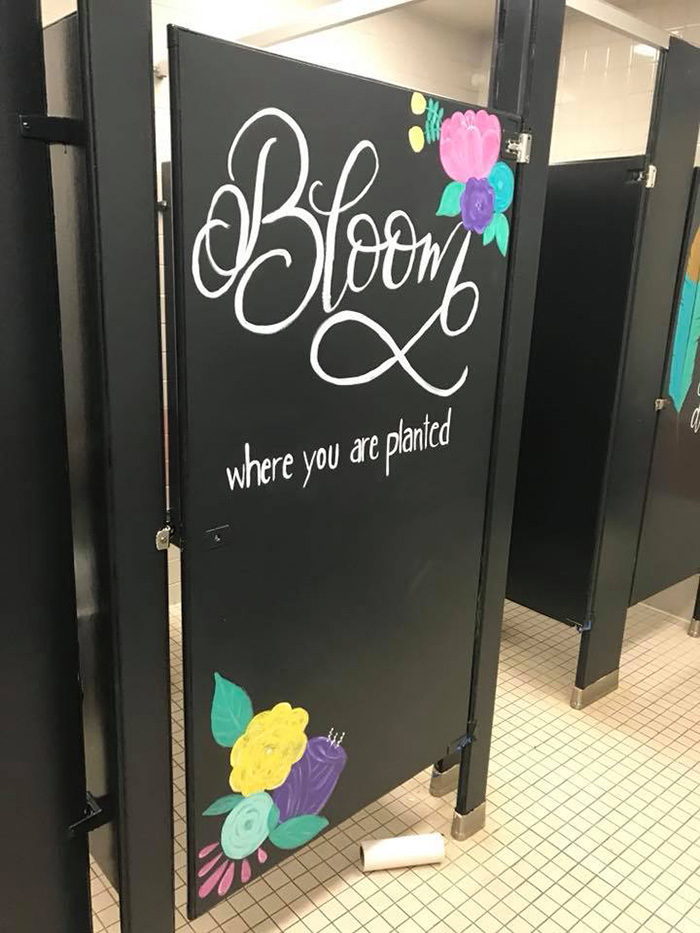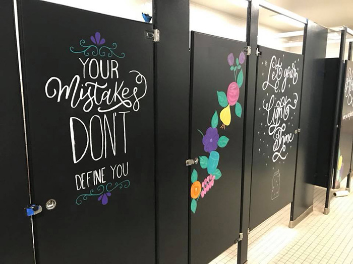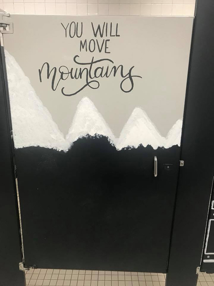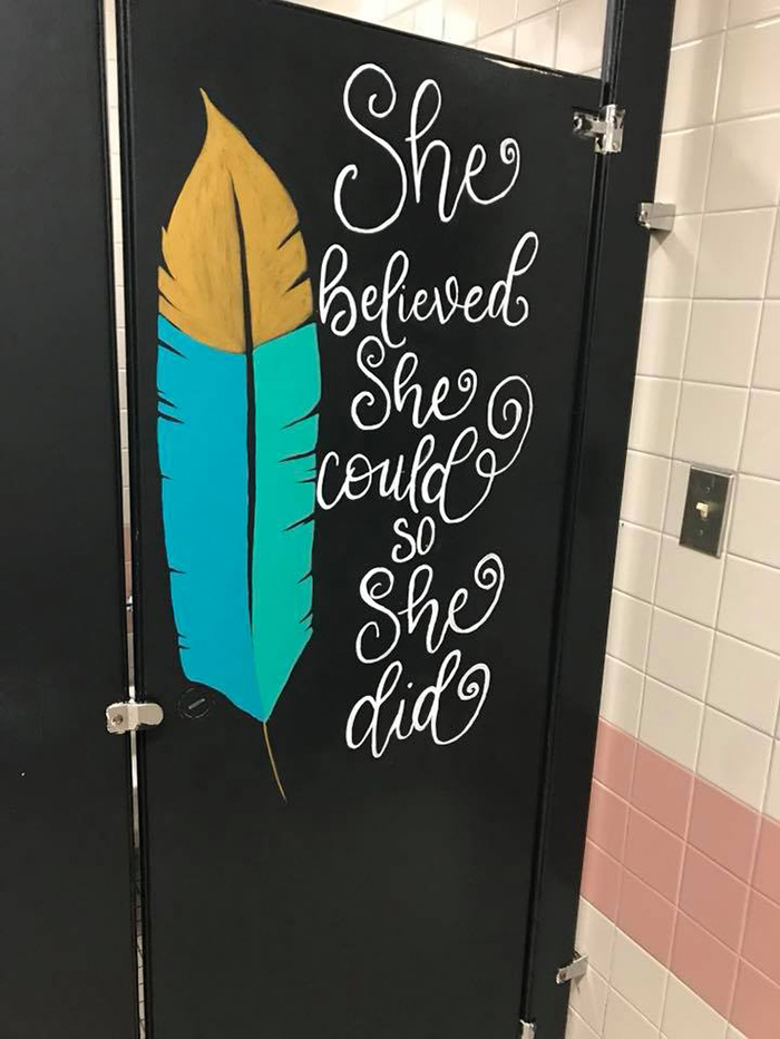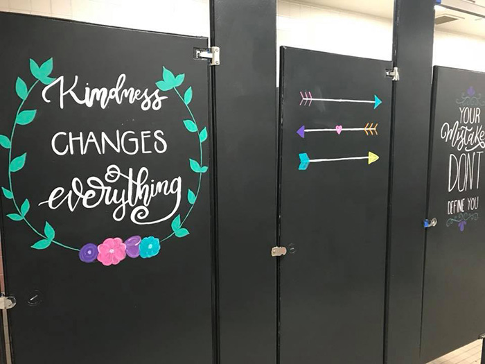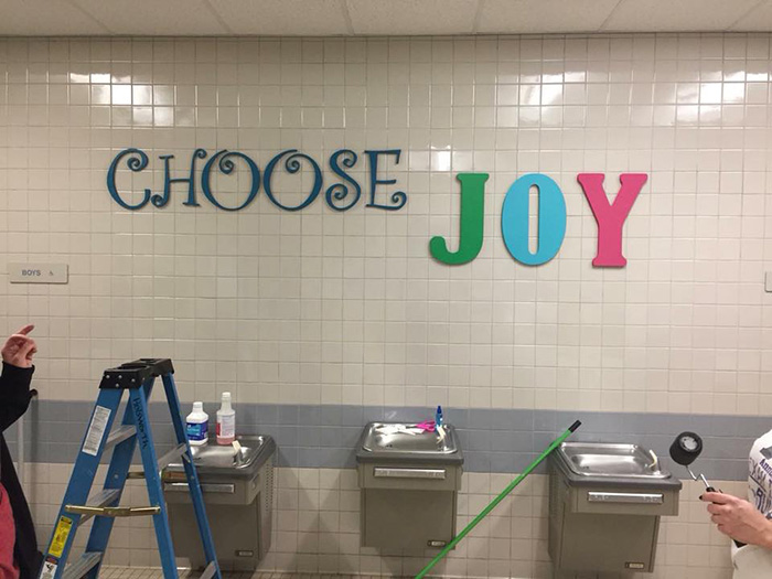Gjashtë nëna dhe dy baballarë pastruan dhe pikturuan dy banjot në krahun e klasës së 5-të. Ata vunë foto dhe shprehje frymëzuese për t’u kujtuar fëmijëve të jenë të sjellshëm dhe “se ata mund të bëjnë gjithçka që duan nëse përpiqen shumë”.