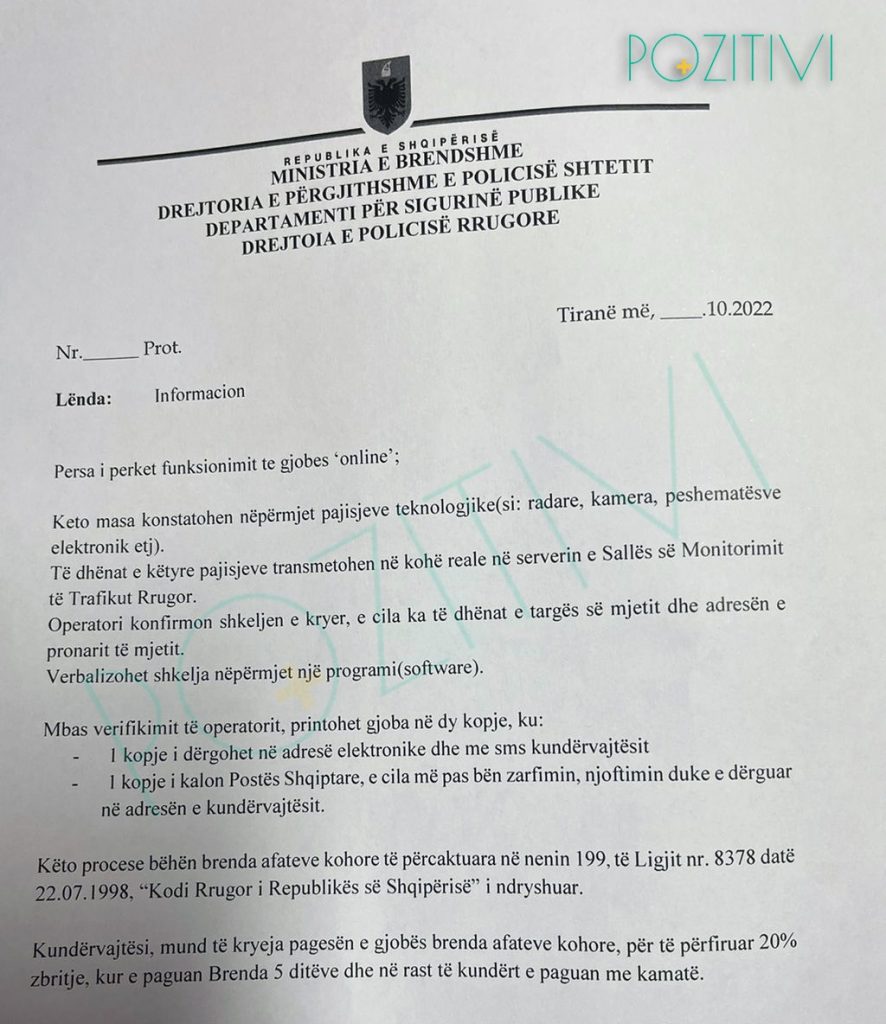 Pozitivi.org u interesua në polici, për mënyrën se si lajmërohen drejtuesit e automjeteve për gjobat që vendosen online. Në shkresën me përgjigjen zyrtare nga policia (foto më poshtë), thuhet se rruga që ndiqet për vendosjen e gjobave online është e tillë: pasi radari konstaton shkeljen nga drejtuesi i mjetit, të dhënat trasmetohen në kohë reale në serverin e Sallës së Monitorimit të Trafikut Rrugor. Pas verifikimit të rastit nga operatorët e sallës, gjoba printohet në dy kopje, njëra prej të cilave i shkon në mënyrë elektronike shkelësit dhe tjetra i shkon në adresën postare. Ky me sa duket ka qenë edhe rasti i personazhit tonë, që ka ndryshuar adresën e banimit.