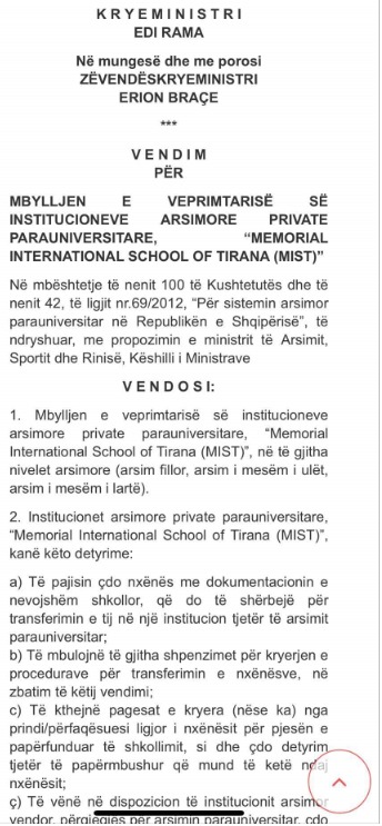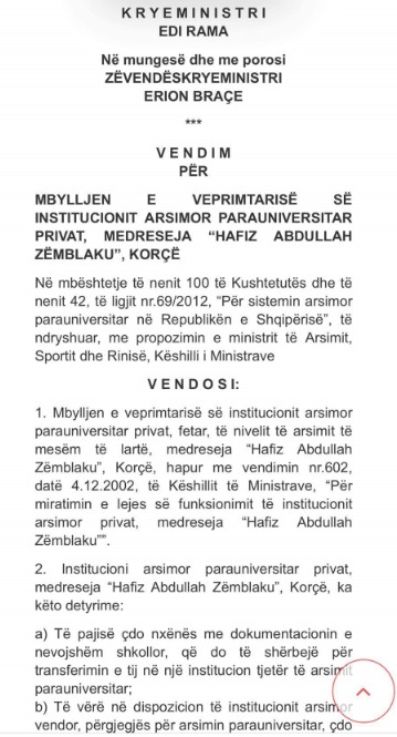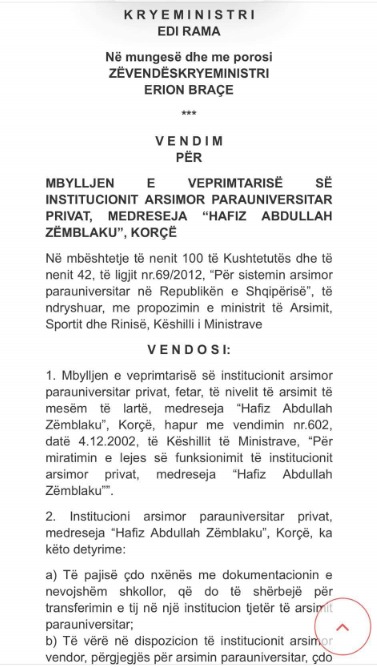“Mbylljen e veprimtarisë së institucioneve arsimore private parauniversitare “Memorial International School of Tirana”, në të gjitha nivelet arsimore. Mbylljen e veprimtarisë së institucionit privat, Medreseja “Hafiz Abdullah Zëmblaku”, Korçë”, thuhet në Vendim të Këshillit të Ministrave.