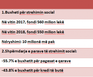 Kujtojmë gjithashtu se numri i familjeve në nevojë që parashikohet të marrin ndihmë për strehim në vitin 2018 rritet me të paktën 34 familje krahasuar me 2017. Ndërsa fondi i buxhetit për 2018 është ulur 10 milionë. Qeveria ka parashikuar që fondi për 2018 të jetë 550 milion lekë. Kurse shpërndarja e parave është planifikuar të jetë: 1. 55.7% e buxhetit për pagesat e qerave dhe 43.8% e buxhetit për kredi të butë.