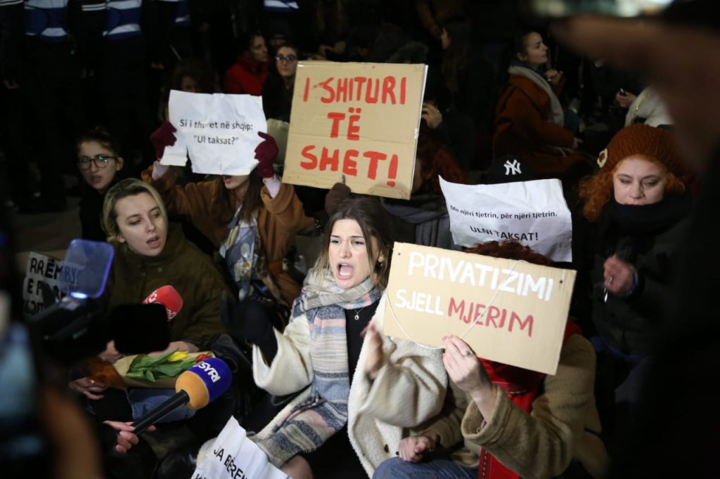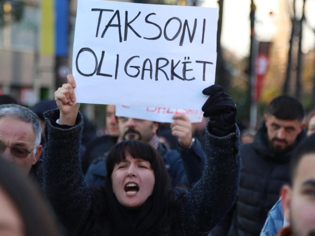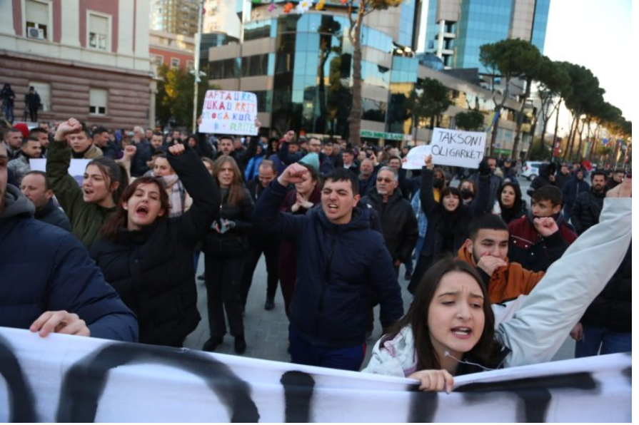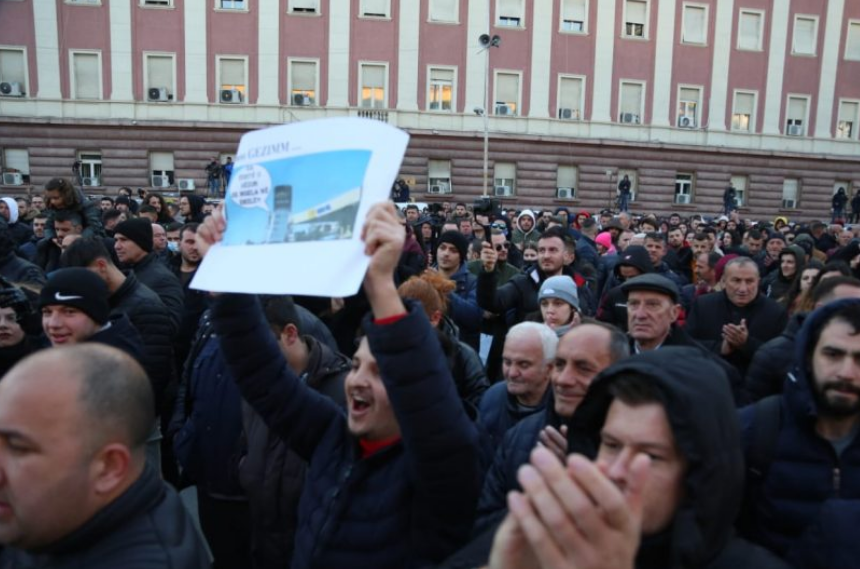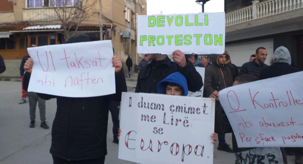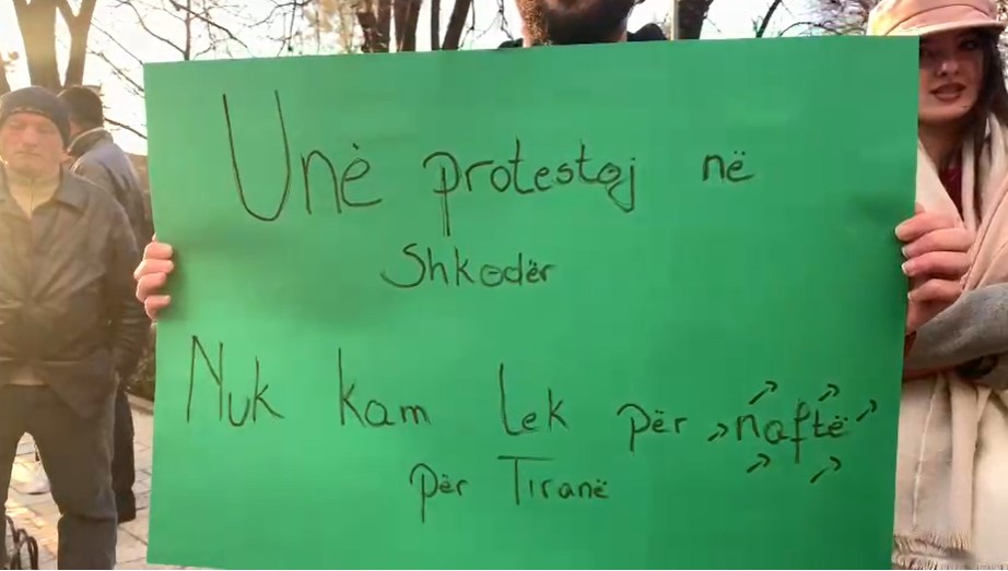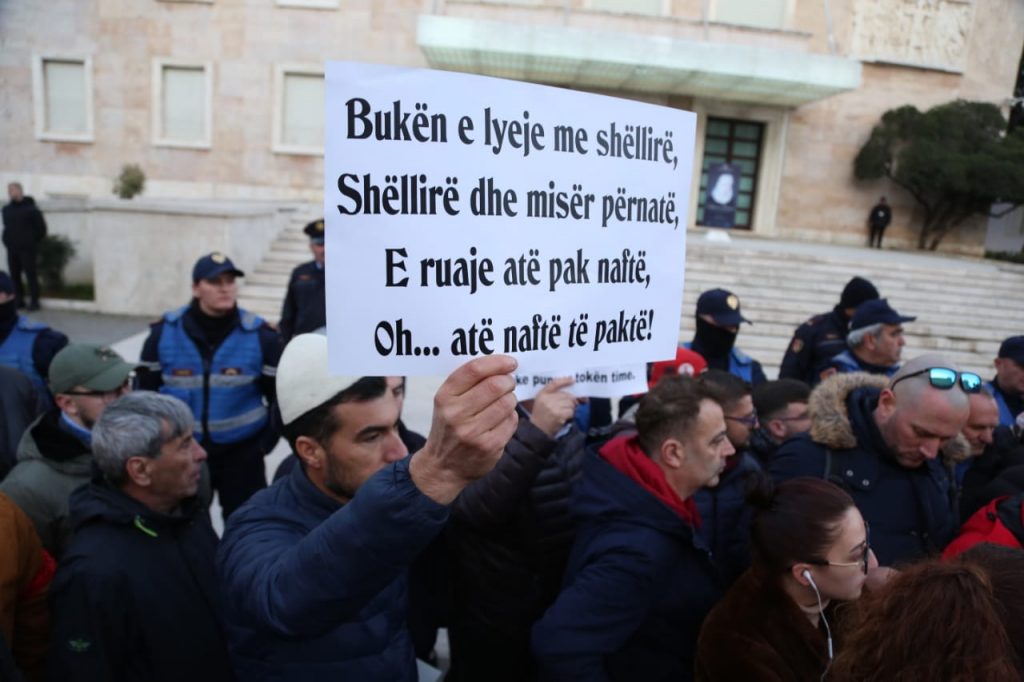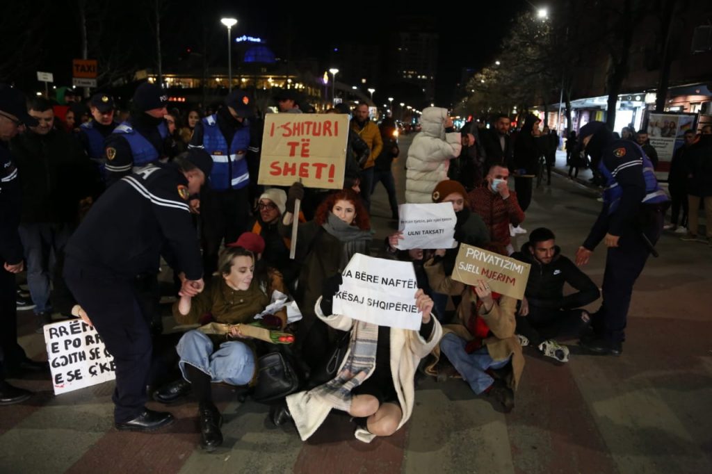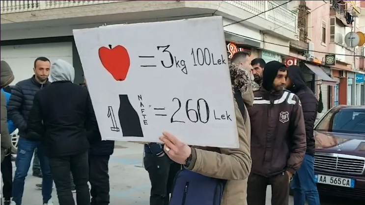 Protestuesit para kryeministrisë në shëtitoren “Dëshmorët e Kombit” mbanin në duar parulla kundër shtrenjtimit të naftës dhe produkteve të tjera bazike.