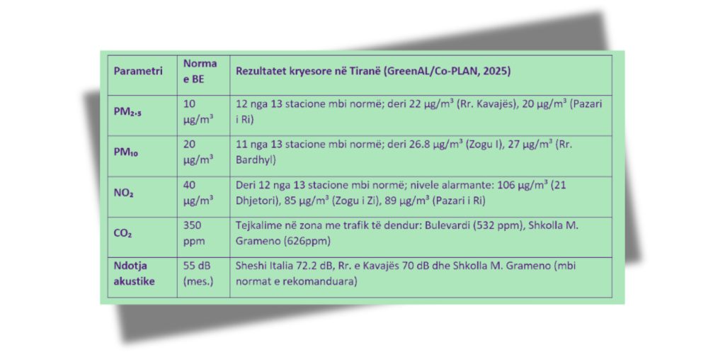 Raporti i fundit i GreenAL, i realizuar nga Co-PLAN, mbi cilësinë e ajrit dhe ndotjen akustike në Tiranë, përmes monitorimeve alternative në 13 stacione, tregon se ndotja në kryeqytet tejkalon në mënyrë të vazhdueshme normat e lejuara. Rezultatet e matjeve për grimcat e imëta, gazrat ndotës dhe nivelet e zhurmës dëshmojnë për një situatë shqetësuese, ku trafiku i dendur dhe aktivitetet urbane janë burimet kryesore. Të dhënat e plota të monitorimit pasqyrohen në tabelën më poshtë (Raporti “Cilësia e Ajrit dhe Ndotja Akustike”, GreenAL/Co-PLAN, 2025).