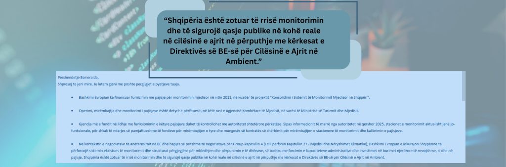 Ndërkohë, direktiva 2008/50 e Bashkimit Europian e detyron Shqipërinë të monitorojë dhe të publikojë të dhënat mbi cilësinë e ajrit. Pa këtë, vendi rrezikon jo vetëm shëndetin e qytetarëve, por edhe procesin e integrimit europian.