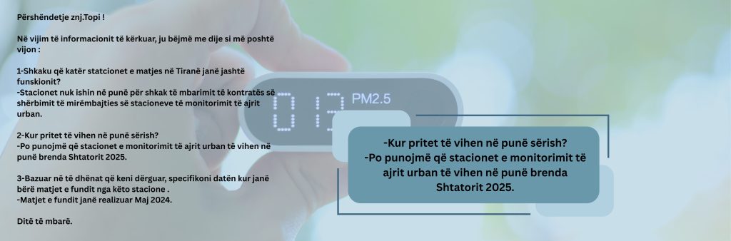Ndërkohë, aparaturat publike të matjes së ajrit në Tiranë janë të fikura prej më shumë se një viti e gjysmë. Tirana, kryeqyteti i Shqipërisë dhe shtëpia e mbi një të tretës së popullsisë së vendit, është sot një nga qytetet më të ndotura por ironikisht, rreziku që na vjen nga ky kërcënim nuk matet.