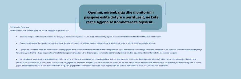“Operimi dhe mirëmbajtja e pajisjeve është detyrë e Agjencisë Kombëtare të Mjedisit”, saktëson Delegacioni i BE-së në Tiranë pas një kërkesë për informim.