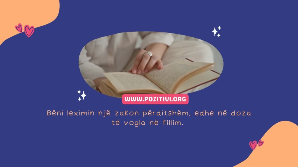 Kthejini librat në rutinë të përditshme, edhe nëse filloni me doza të vogla në fillim. Duhet të ndërtoni rutinë të rregullt për të lëvizur më në fund interesin ndaj leximit. Lexoni kur zgjoheni, lexoni gjatë pushimit të drekës, lexoni për njëzet minuta në mbrëmje para se të hapni televizorin ose laptopin. Nëse “multivitamina” kthehet nw vakt tw plotë, fantastike, por nëse jo, do të keni bërë të paktën disi progres dhe do të keni përkrahur zakonin tuaj të ri të leximit.
