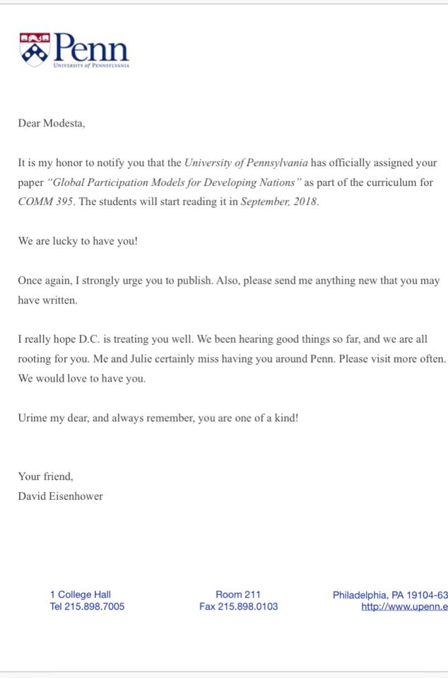 Përveç që ka mbaruar studimet me sukses të shkëlqyeshëm, një nga punimet e saj tani është material i detyrueshëm në planprogramin e këtij universiteti prestigjioz amerikan, ku shkollohen liderët e së ardhmes. Tej mase krenare me Modesten! #ÇikateKosovës”, ka shkruar ambasadorja.