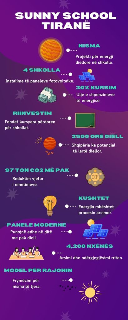 “Sunny Schools” është një projekt që pasqyron qëllimin e Tiranës për një të ardhme më të gjelbër dhe të qëndrueshme. Përmes instalimit të paneleve diellore dhe integrimit të edukimit mjedisor, ky projekt jo vetëm që ka ulur kostot financiare, por ka ngritur edhe ndërgjegjësimin e brezave të rinj mbi rëndësinë e energjive të pastra. Të ardhmen tonë të përbashkët, Tirana e përfaqëson si një model të shquar për zhvillim qëndrueshëm.