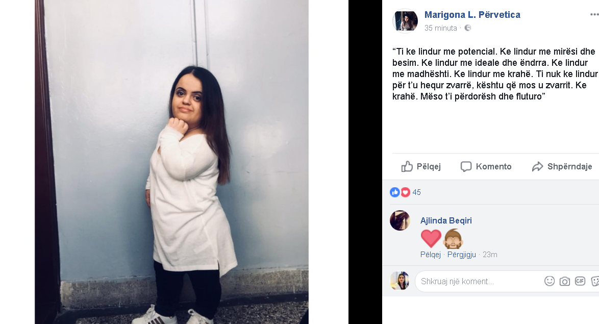 Sot me anë të një postimi reflekton dashurinë dhe respektin që ka për ëndrrat, jetën dhe veten e saj. “Ti ke lindur me potencial. Ke lindur me mirësi dhe besim. Ke lindur me ideale dhe ëndrra. Ke lindur me madhështi. Ke lindur me krahë. Ti nuk ke lindur për t’u hequr zvarrë, kështu që mos u zvarrit. Ke krahë. Mëso t’i përdorësh dhe fluturo”, shkruan Marigona krahas fotos së saj.