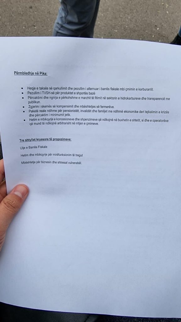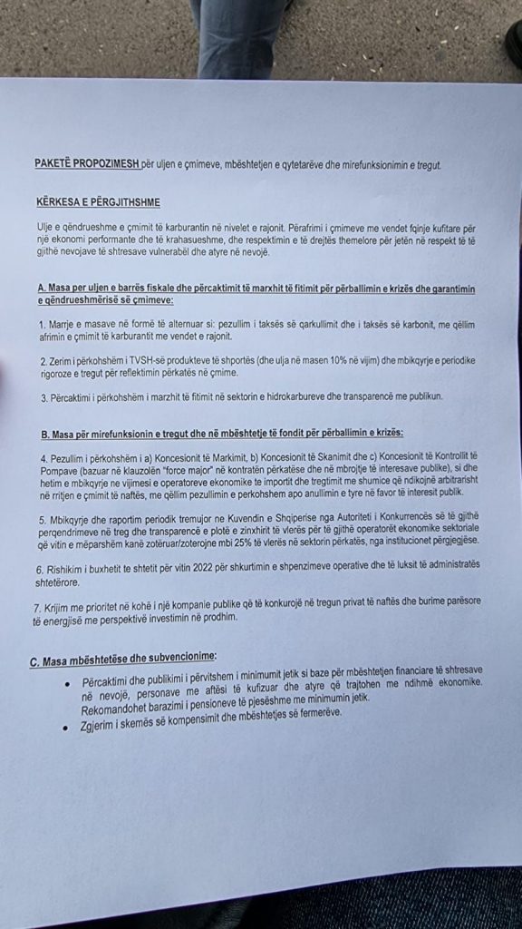 Kërkesa numër një është ulja e qëndrueshme e karburanteve me vendet e rajonit. Masa për uljen e bazës fiaskale dhe përballimin e marzhit të fitimit. Pezullim i taksës së qarkullimit dhe asaj të karbonit. Zerimi i përkohshëm i taksës së shportës. Përcaktim i përkohshëm i marzhit të fitimeve në industrinë e hidrokarbureve.