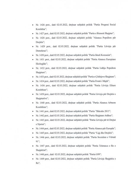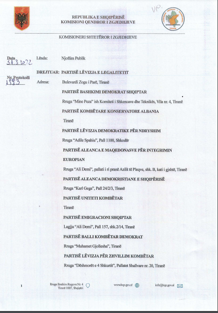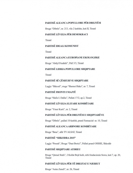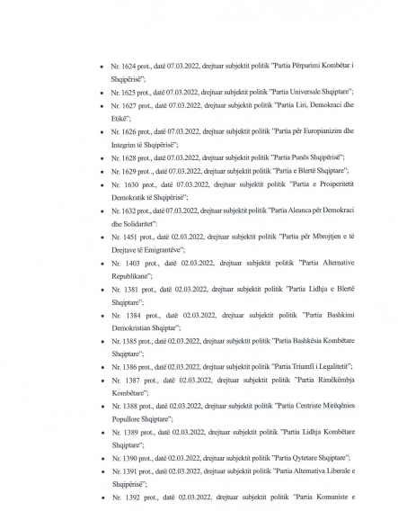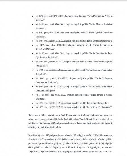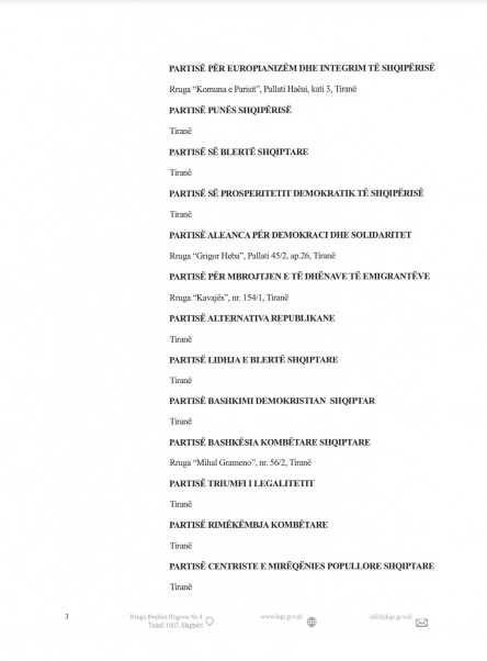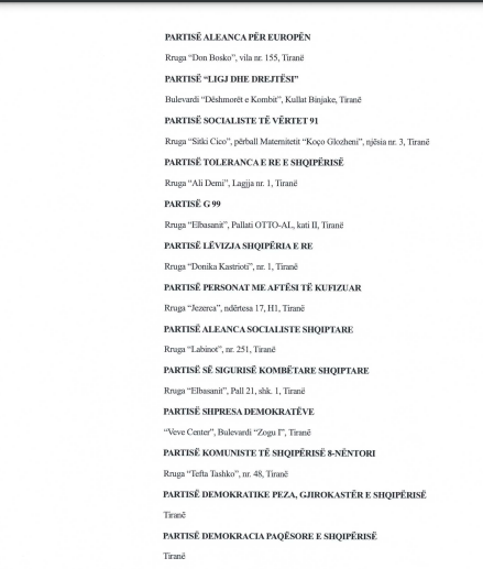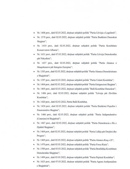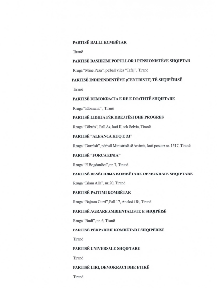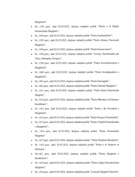 Shkresa me emrat e 94 partive politike që i’u është drejtuar shkresa nga KQZ.