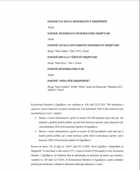 Rreth një vit më parë Komisioni Qendror i Zgjedhjeve ndëshkoi me gjoba 1 dhe 2 milionë lekë 106 parti që nuk dorëzuan raportet financiare për vitin 2020 dhe 50 mijë lekë për katër parti të tjera që i patën dorëzuar ato me vonesë.
