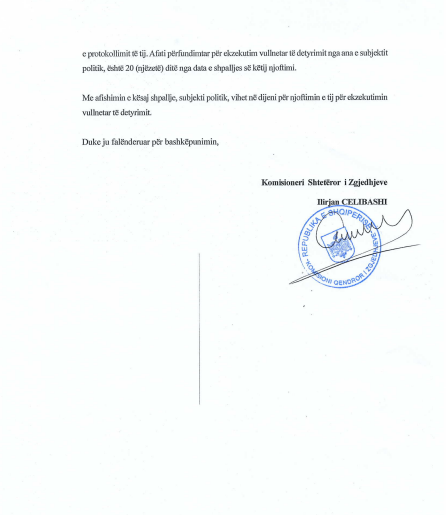 Bazuar në nenin 162, të ligjit nr. 44/2015 “Kodi i Procedurave Administrative”, për njoftimet publike, nga sot, 94 partitë politike kanë 20 ditë afat për të ekzekutuar vullnetarisht detyrimin e tyre.